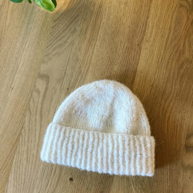 The hat itself is cute – but I’ll make it smaller in diameter next time, and possibly an inch or two longer, so I can fold the brim up above the ears. I like the way the decreases spiral upwards (just simple k2tog). I used leftover recycled yarn from last year (I wouldn’t buy this specific yarn again – it doesn’t have much wool fibre and is not very resistant over time). I don’t know what kind or colour of yarn I’ll use for the real (non-tester) beanie… can’t decide between fluffy mohair or something smooth, dark or light 🤷‍♀️ We’ll see!