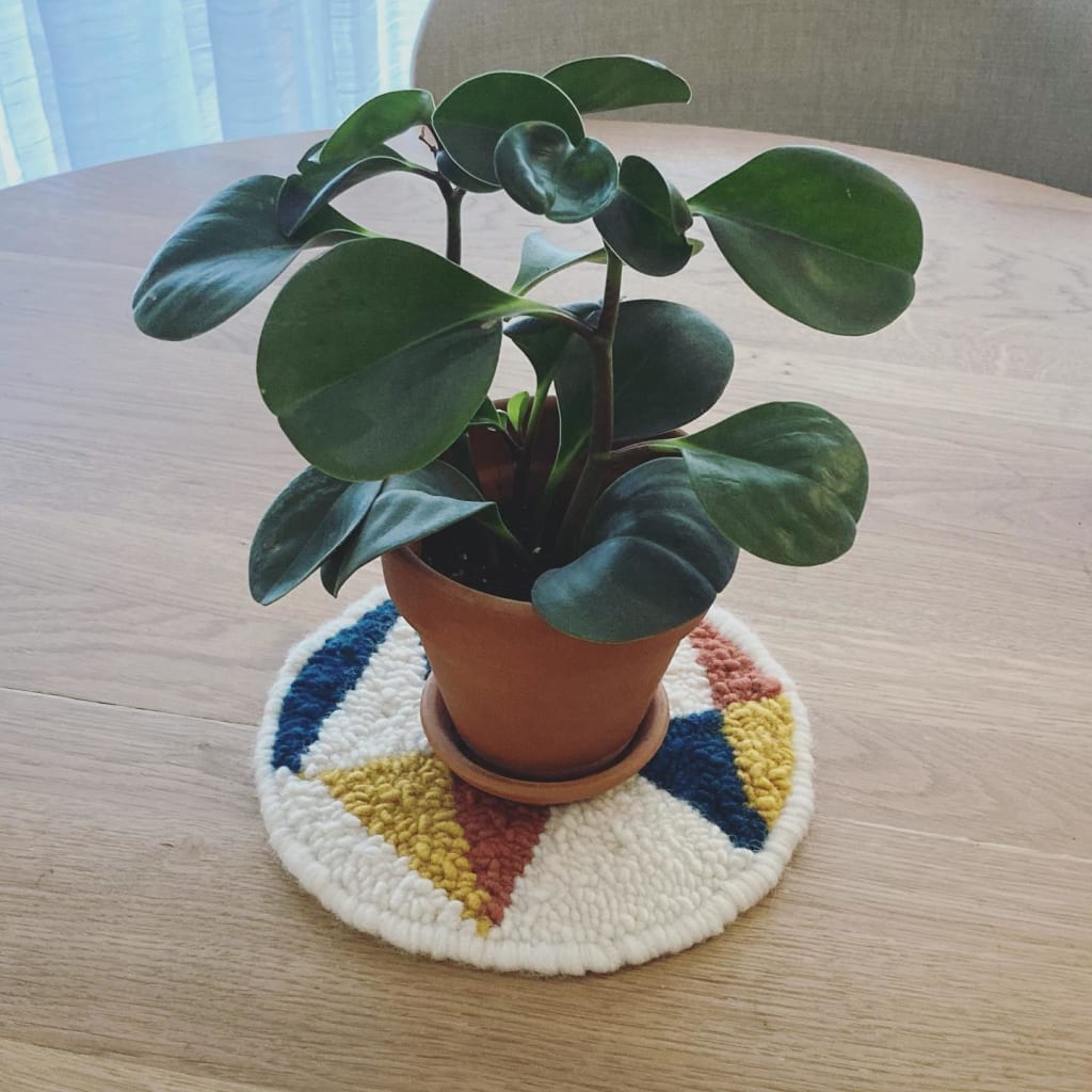 This is the trivet pattern from @bookhou’s punch needle book. I love so many of the projects in that book (cushions, pouches, rugs, baskets) – but wanted to start with something small. The trivet is meant for holding hot teapots and stuff, but I like it with a plant on it 😁
