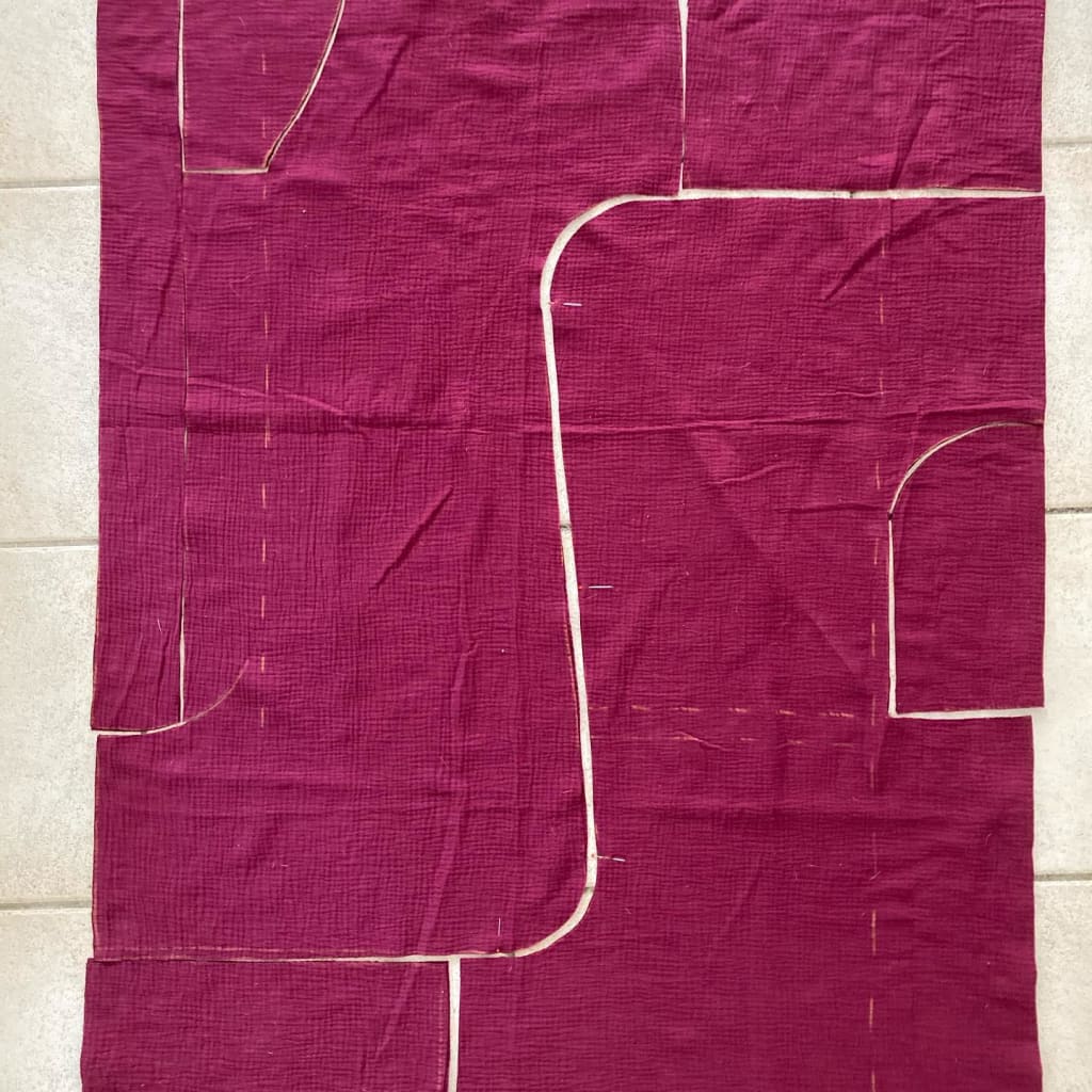 Iβm short and more pear-shaped than patterns are generally drafted for, so made my paper pattern accordingly. I also shortened the sleeves (which had the effect of making the inseam pockets bigger) and changed the neckline to more of a V-neck shape. β οΈ But I made a major error by drawing it based on my 135cm fabric width and not the referenced 115cm β so when I shortened for my (lack of) height, I ended up with something for a much taller body than mine, and the crotch was 10cm too low π