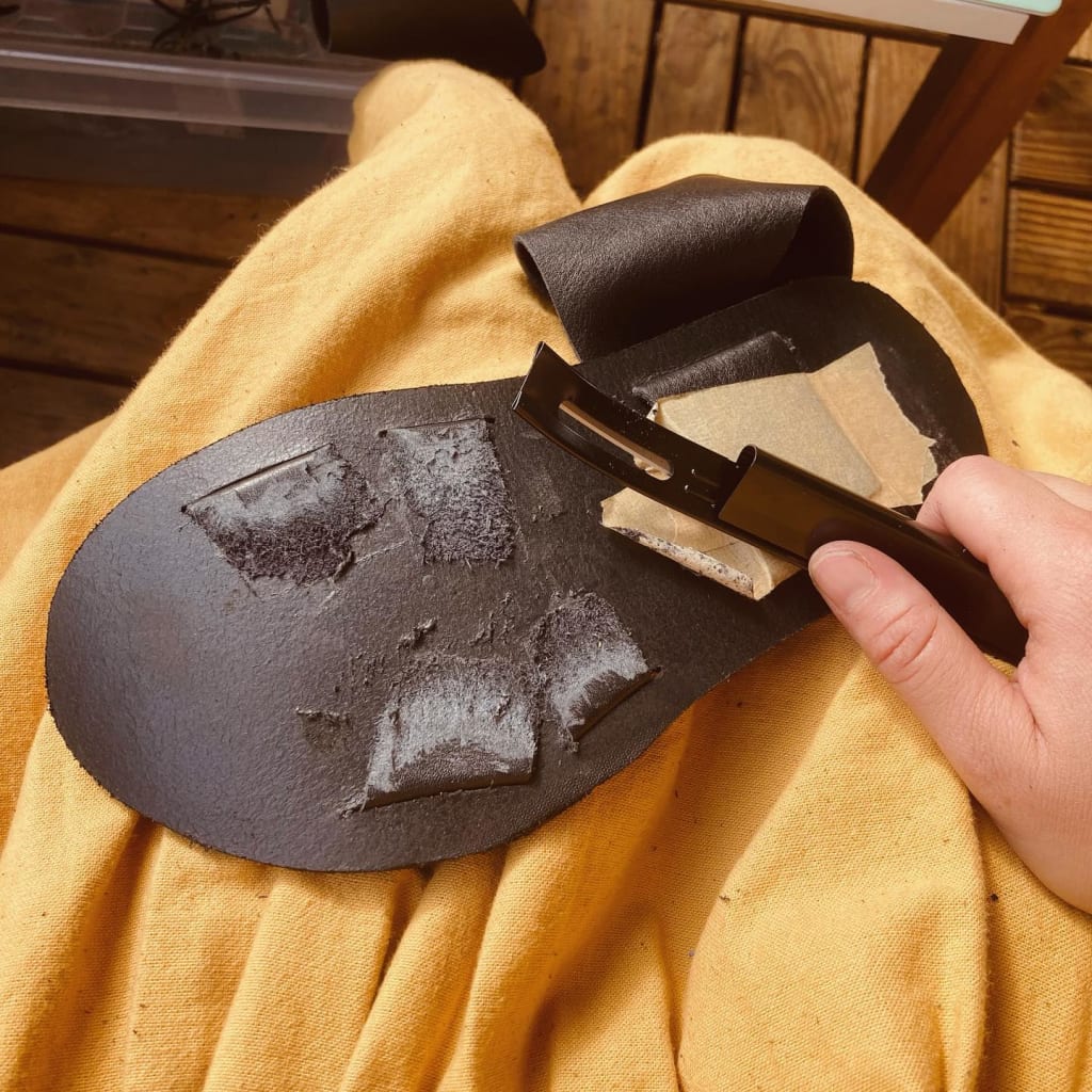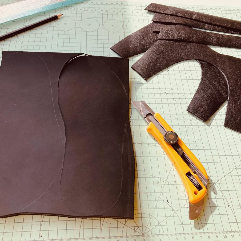 I cut out the paper patterns first to see how it looked on my foot, then quickly moved to cutting, fitting, glueing, skiving (shaving the leather with a knife to remove bulk), and eventually sanding (in a cardboard box with arm holes in the sides and plastic wrap on top). It was my first time trying to skive leather and I did a pretty terrible job - but it’s hidden between the soles and footbeds so it’s ok right? 🙈