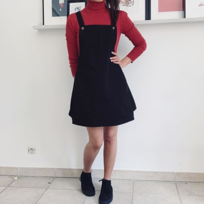 Low-waste Smith Pinafore dress crafted from less than 1 meter of French organic cotton denim. Features custom sizing adjustments, hidden waist pockets with cotton sateen lining, and jeans button closures. Versatile design suitable for year-round wear with minimal fabric waste.