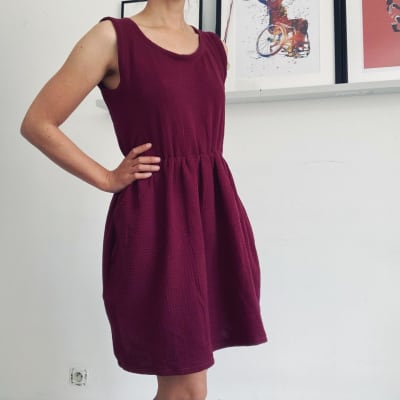 Self-drafted zero waste dress using 100x135cm cotton double gauze, featuring blousy sleeveless bodice with hidden elastic casing, back slit with covered button closure, and hidden seam pockets made from armhole cutouts. Custom-sized design demonstrates creative pattern cutting for woven fabrics.