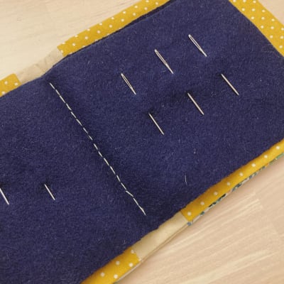 First hand-sewing project: a needle book crafted from fabric scraps, featuring wool from a coat, cotton from a shirt, and interfacing. A practical sewing tool made with sustainable materials and basic hand-stitching techniques.