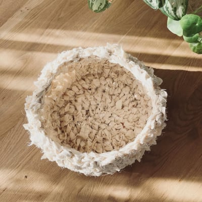 A meaningful crochet project: this rustic basket is made from rag yarn created from a year's worth of sewing toiles. Using a simple double crochet technique and a 15mm hook, this project turned fabric waste into a beautiful story of personal growth and body acceptance.