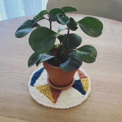 A cozy punch needle project: this small decorative rug features a design from Bookhou's pattern book. Made with bulky wool and a 10 punch needle, it's perfect as a plant stand or trivet.