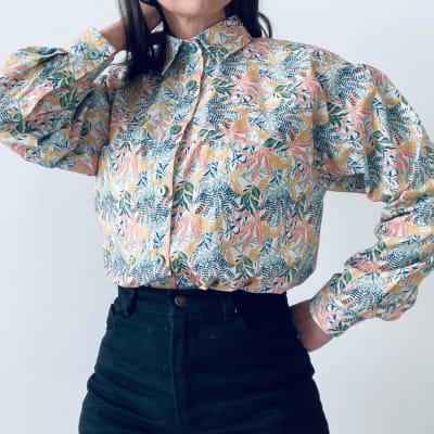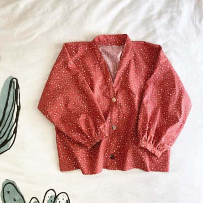 Modified zero waste cropped shirt pattern featuring extended length and long sleeves, crafted in organic cotton with mother of pearl buttons. Demonstrates pattern versatility and sustainable sewing through adaptable sizing and zero fabric waste techniques.