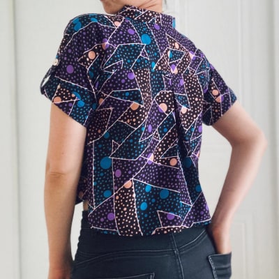 DIY zero-waste shirt design combining elements from multiple patterns to create a fitted cropped style. Features A-line shape, curved hem, back pleat, and creative collar-to-scrunchie transformation, demonstrating sustainable pattern cutting techniques.