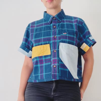 Sustainable fashion transformation: turning an oversized men's shirt into a stylish cropped top. This upcycling project shows how to breathe new life into secondhand clothing through creative refashioning.