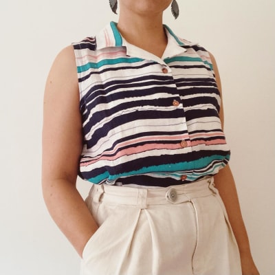 Sleeveless Agave shirt made from striped linen remnants with white facings. Size-inclusive pattern perfect for warm weather, designed to be worn tucked in or out.